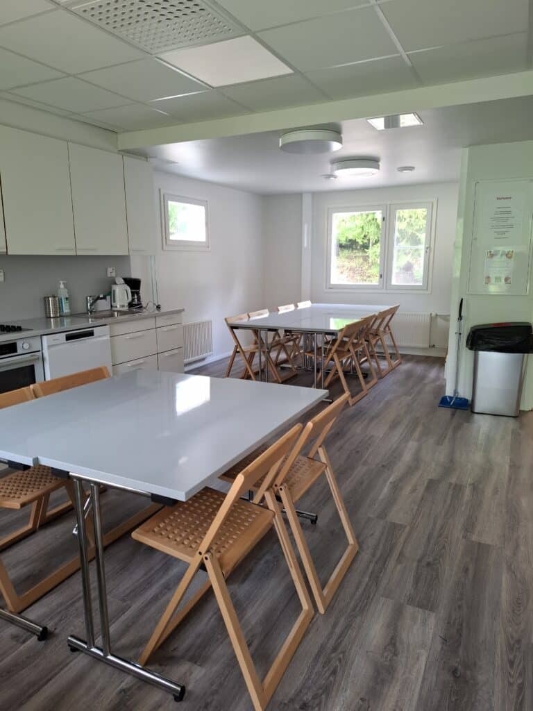 - Pöytätilaa 12–16 henkilölle (taittopöytiä ja -tuoleja)