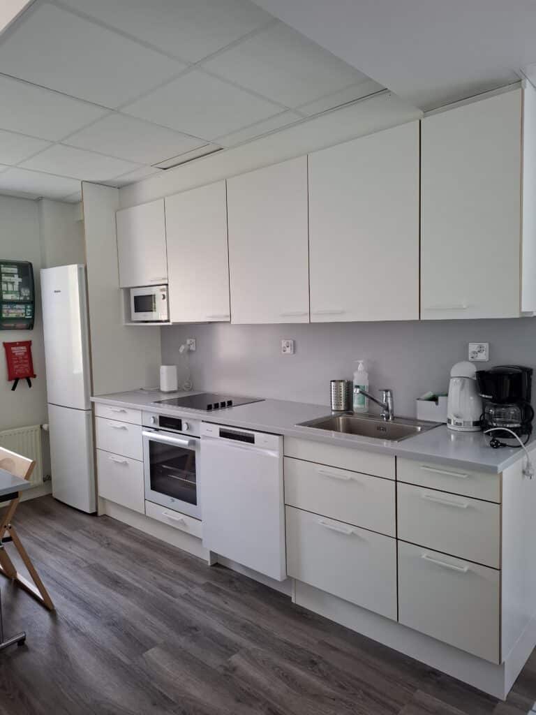 - Pieni keittiö: astiat, jääkaappi, uuni sekä tee- ja vedenkeitin